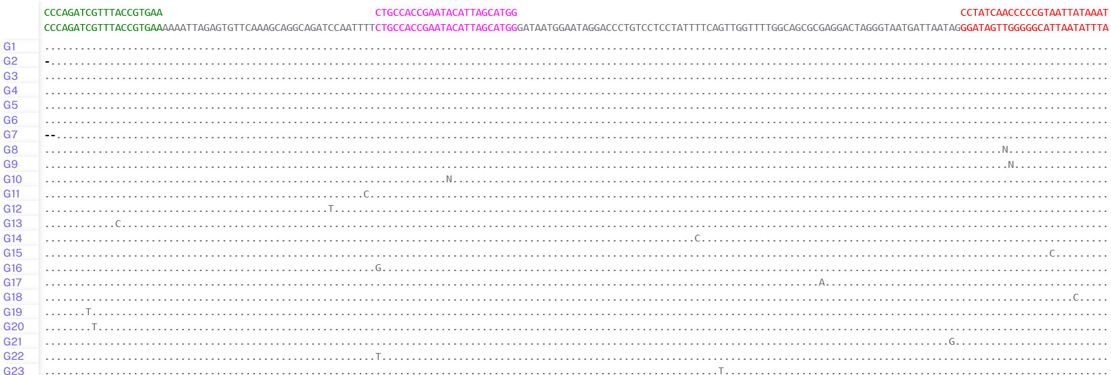 - Displays oligonucleotide binding locations across all accessions.